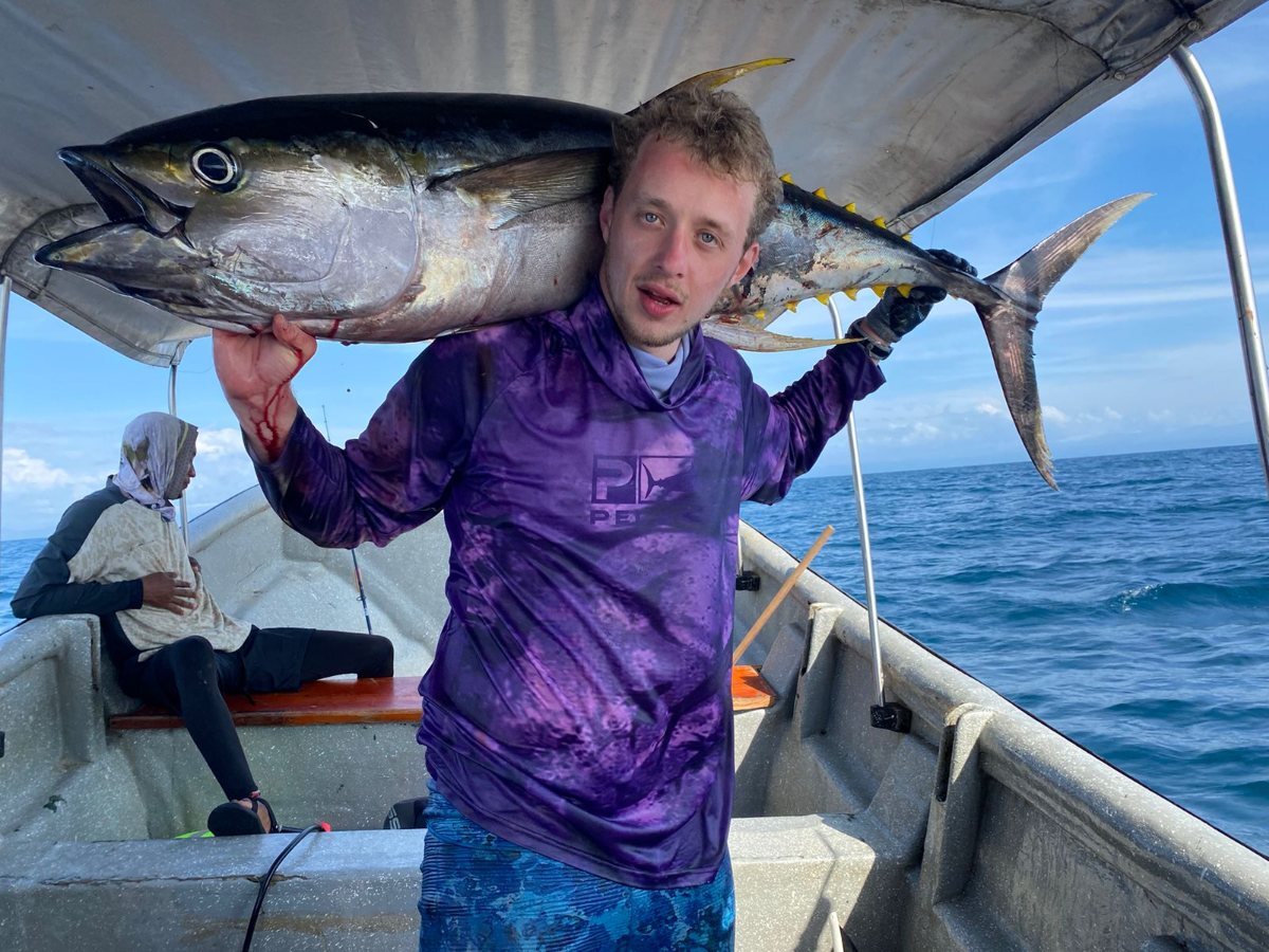 Il faut aussi que je vous parle de la saison de Sacha, chasseur croate qui vient d'octobre à mars avec ses deux superbes fusils Triton, un invert et un roller. C'est un chasseur de haut niveau, 52 ans, grande expérience un peu partout sur la planète, agachon de 2mn à 25m......capable de descendre à 45m. Cette saison, il est sorti avec son bateau, panga de construction locale et 100cv derrière plus un sondeur/gps humminbird. Chasses 3 fois par semaine en moyenne, de 8 à 10heures en mer......Une force de la nature le Sacha. 1.78m pour 90kg et 2 paquets de clopes par jour! Il s'en est pas mal sorti, des pêches de 10 à 30kg de poissons benthiques, la plupart du temps dans des eaux sales avec 2 à 5m de visi, même pas peur des requins le Sacha. Il rague beaucoup sur des fonds de 20/25m, et il a perdu 4 flèches au fond..... Evidemment peu de pélagiques au tableau, quelques petits thazards de 2/3kg et tout de même un TDC de 10kg un jour d'eau claire. Il fait régulièrement 100km de bateau durant ces 10h de sortie. Voilà, une autre façon de voir la CSM totalement différente de la mienne actuelle, basée uniquement sur la recherche de thons et espadons. Un peu écoeuré tout de même de la saison pourrie, il envisage de transporter son bateau à Diego Suarez et Nosy Bé pour la saison prochaine. -