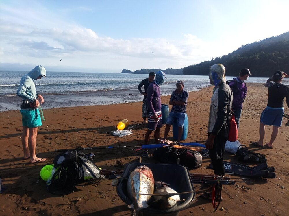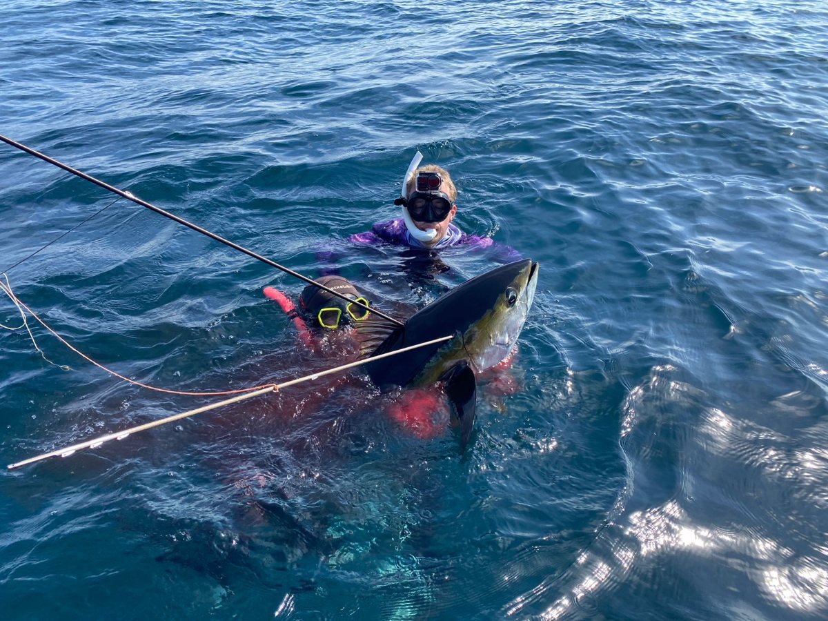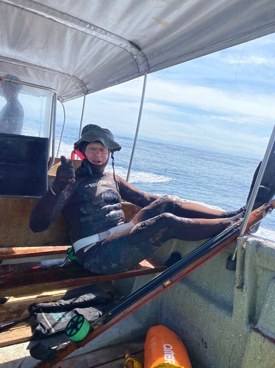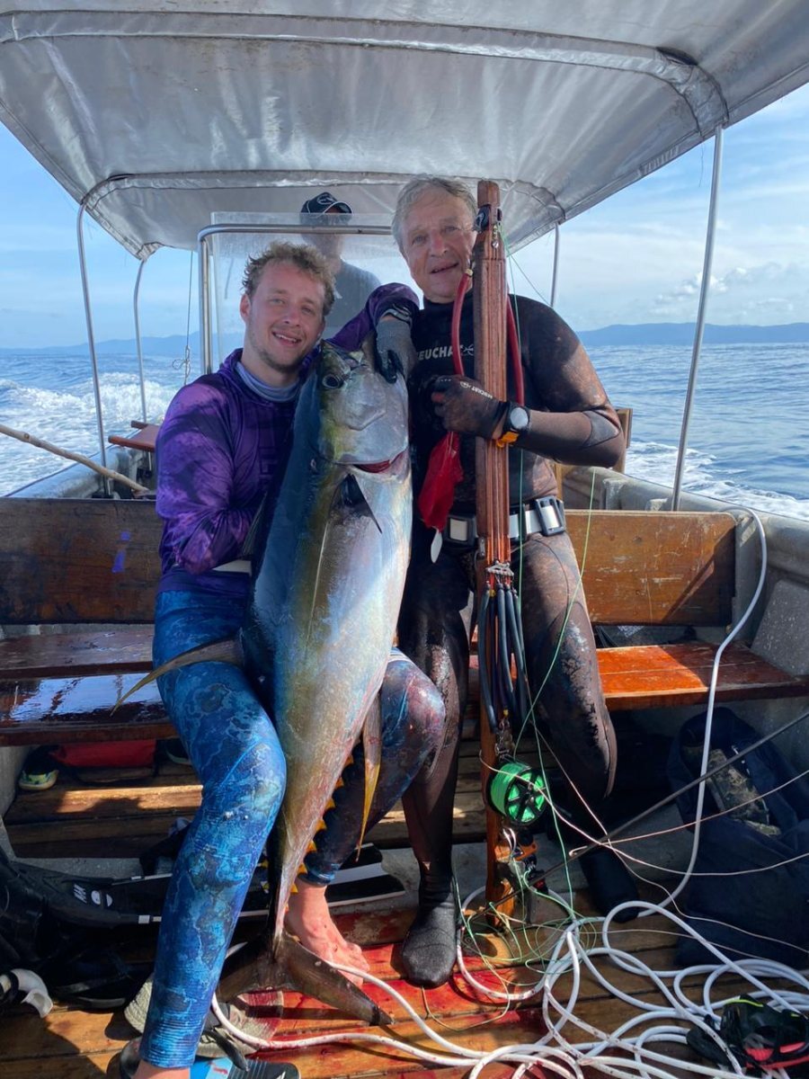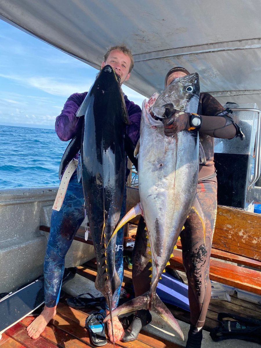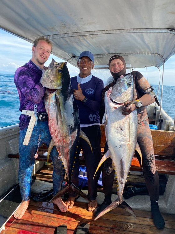 Comme dom85 parle que les carpes rouges se font facilement au pole spear ! 🤣 Je voudrais d' ailleurs qu il nous montre des photos ou mieux des films quoiqu avec l IA maintenant tout est possible ,a la main aussi sûrement ..... Bon alors ,allons faire de l albacore ....une journée un peu au large .Nos deux bouées sont crevées avec les journée bateau et transport bateau/maison pas simple a marée basse ,on sera donc tous les deux au moulinet ,les bouées au cas où avec 10/20 m attachées aux fusils avec un semblant de pression ! 😂 Le but c est de voir des oiseaux ou des dauphins chassés ,on se jette du bateau on plonge et ....on tire si l on peut ....vraiment pas simple pas besoin d' aller profond a 7/8 m je vois plus ma main tellement l eau est pourrie ....des centaines de dauphins mais peu d oiseaux .....on verra les thons 5 fois environs moi 2 fois car je perdrais ma ceinture a la troisième malheureusement la où il y en avait le plus mais j' ai eu la chance d ouvrir les hostilités a la deuxième ,un tir rapide qui traverse le thon part vite freiné par le parachute ,il luttera 4/5 minutes et prendra 3 flèches doublé par loic et pour ne pas perdre trop de temps mais que 15 m de files......Loic tirera le sien au moment où je perds ma ceinture mais rattrapé mon moulinet qui s' est détaché ! 🤣 Les thons passeront ,il en tirera un dans la queue et le suivra un maximum en palmant comme un fou pour ne pas qu il se détache ,il prendra 80/90 m de fil avant que cette fois cela soit moi qui le double .....ensuite Tanguy après avoir cassé a la canne viendra me remplacer mais il ne se fera rien d autre sauf de belles vidéos avec les dauphins ,se fut donc bref mais très intense tout au long de cette journée .....😇