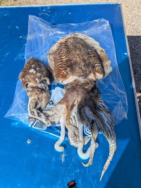 Sortie cet après-midi sur Saint- éno. Malgré le fort vent de sud la visi est mauvaise et laiteuse, 1m50 environ. Ça bouge au fond et j'ai remarqué que les seiches n'aiment pas ça, elles s'ensablent encore plus. Je sauve la sortie en tirant la plus grosse seiche de ma vie, magnifique et monstrueuse sous l'eau ! Un beau repas à elle toute seule! @antho35 tu t'y mets quand 😜? Je n'ai pas vu de roussette au cours de mes trois dernières sorties. Simple coïncidence mais j'ai remarqué que les hivers où je vois beaucoup de roussettes, je vois beaucoup de bars au printemps et en été. Malheureusement l'inverse est vrai, comme l'an passé 😢 -