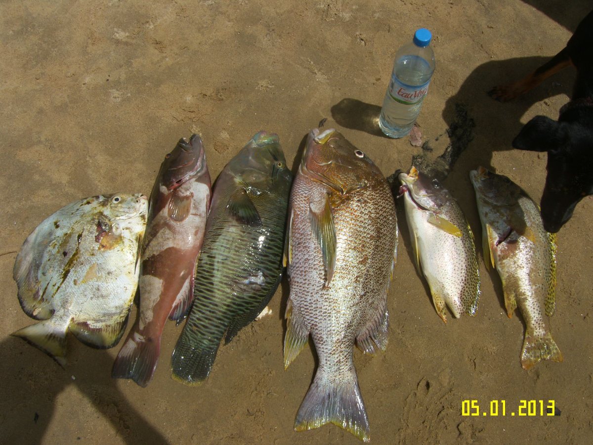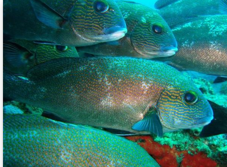 Pour les diagrammes ou grosses lèvres, il en existe 32 espèces....de quoi se perdre. La plupart ne sont pas très bon sauf deux que je connais: le 3 barettes dont vous avez vu les photos et le plectorhinchus flavomaculatus ou taches de rousseur. Celui ci est différent, il n'est pas très gros, 1 à 1.5kg, je l'ai toujours vu en en couple et n'est pas très courant. la photo montre pourtant un troupeau Les gris ne sont pas bons. Un jour , j'en ai pris un moucheté (plechtorhinchus gaterinus) dont la queue avait été coupée, surement par un barracuda, il nageait tout à fait normalement. -
