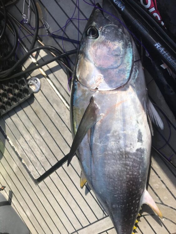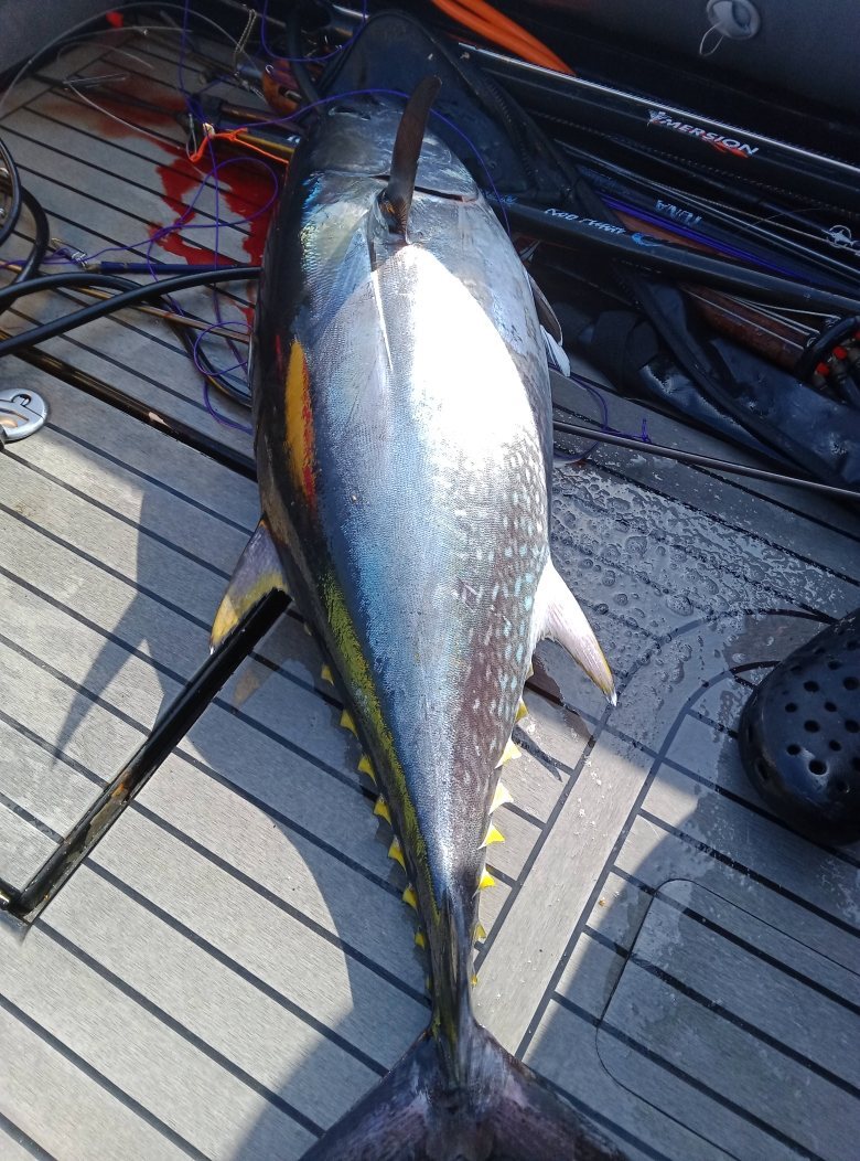 2. La présence de sérioles n'est pas vraiment une nouveauté dans le Finistère. Par contre, au mois de novembre c'est un peu exceptionnel. Il y en a de vues et de capturées épisodiquement depuis assez longtemps. J'ai souvenir d'un spécimen de 17 kgs fléché par un collègue en 2003 au Cap de la Chèvre. Mais dans la série des rencontres improbables, on peut également citer la capture de ces thons patudo (ou obèse ou big eye) à quelques milles des côtes du Cap Sizun début octobre. Ils n'étaient pas en côte mais pas non plus au grand large. De même il ne s'agissait pas de poissons isolés mais de bancs assez compacts. En tout cas, c'était un superbe spectacle que de les voir exploser un banc de balaous, poisson fourrage préféré des thonidés et dont la présence est également avérée depuis une quinzaine d'années. On verra si le patudo s'installe durablement dans les prochaines années. Ce serait formidable car c'est une chasse sympa, sans contraintes règlementaires (...), et ils ont une chair vraiment excellente.