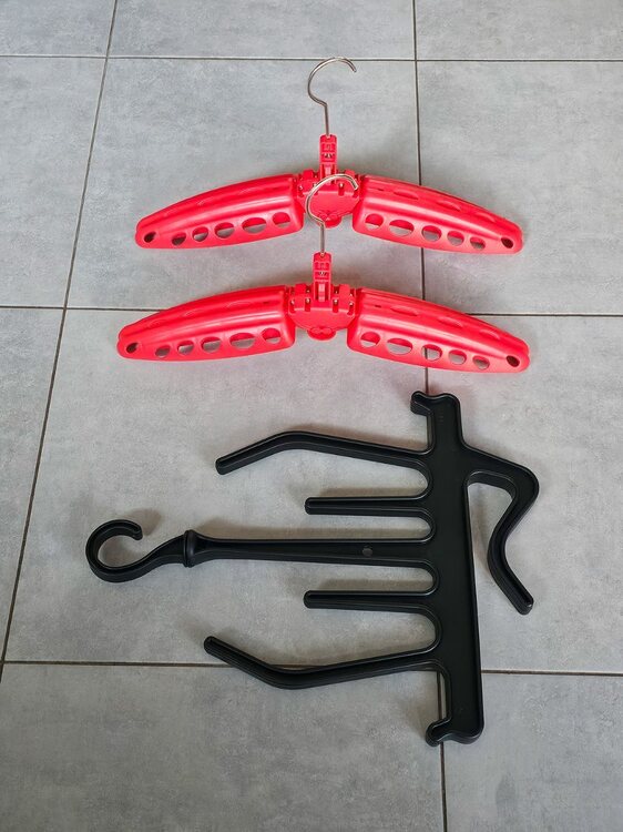 Je ne cite pas le fournisseur car je ne sais pas si j'ai le droit de le faire ici. Peut-être possible à trouver ailleurs mais reçus ce matin et ça peut intéresser du monde peut-être : Imitation de sabots en plastique d'une marque bien connue et bien pratique pour pas bousiller ses chaussons en néoprène, semelle très épaisse et donc quelques années à arpenter les caillasses avant leur mort - 11€86 Paire de cintres pour faire sécher les combars, pas donné pour du chinois mais c'est du costaud et ça se plie si on veut le ranger en gagnant de la place - 16€51 Toujours pas donné pour du chinois ,cintre pour là encore faire sécher les accessoires chaussons, gants, etc...au moins 3cm d'épaisseur, c'est vraiment du solide - 21€21
