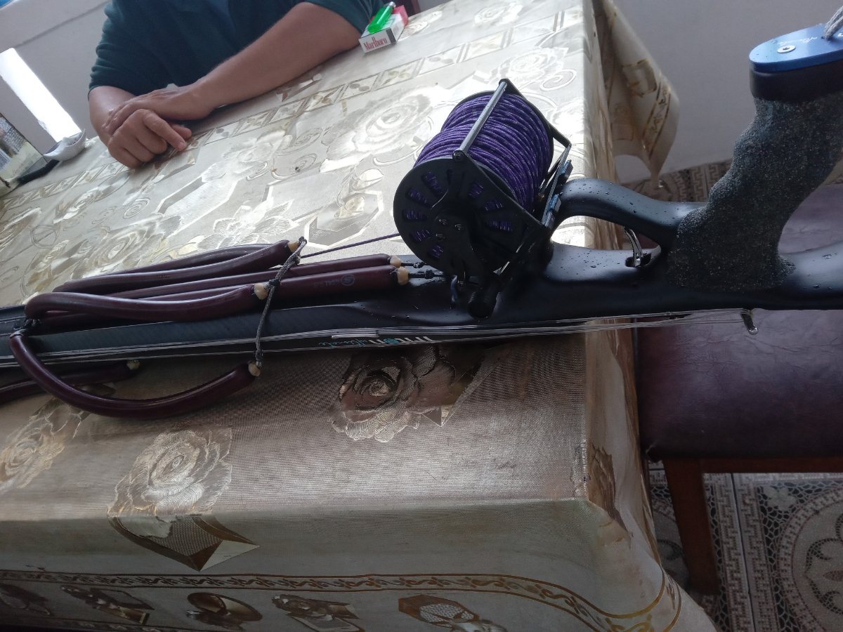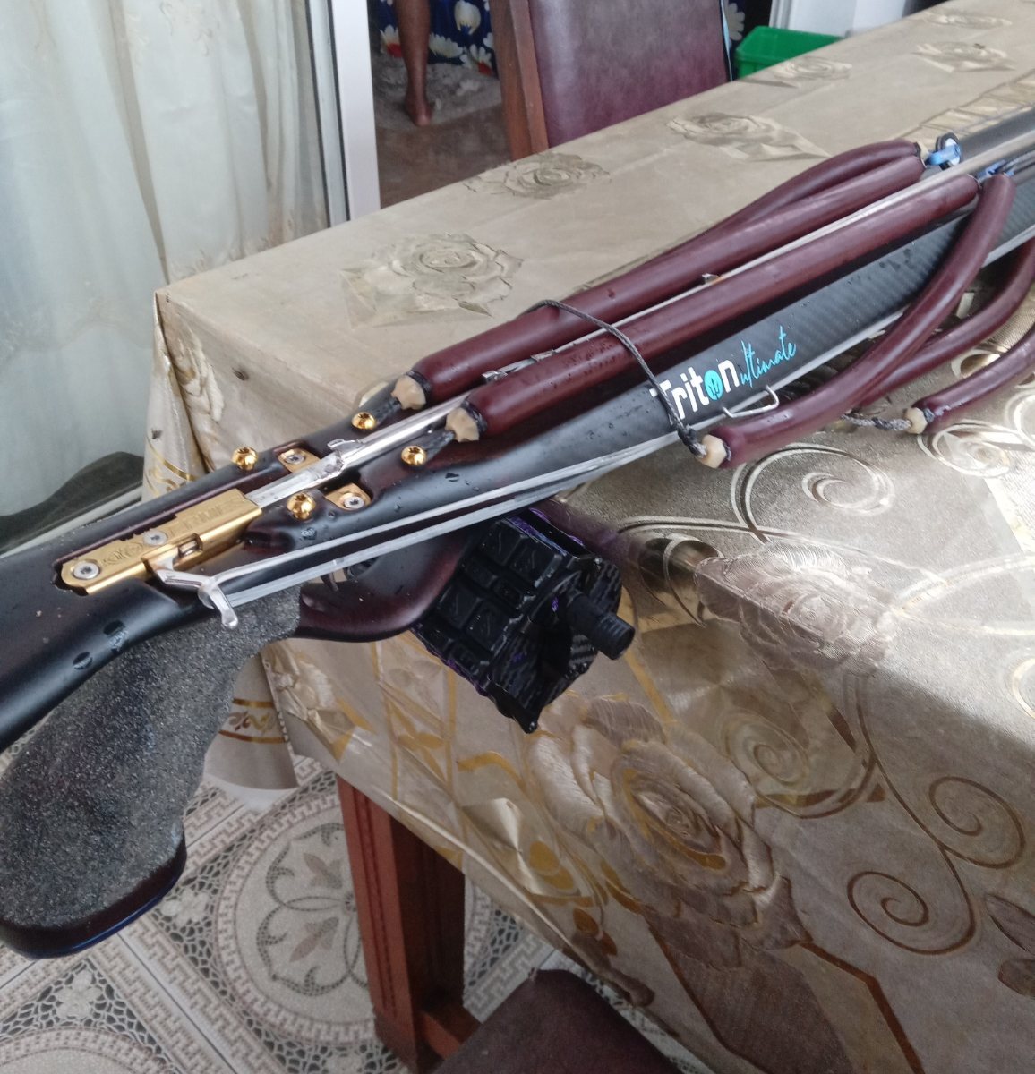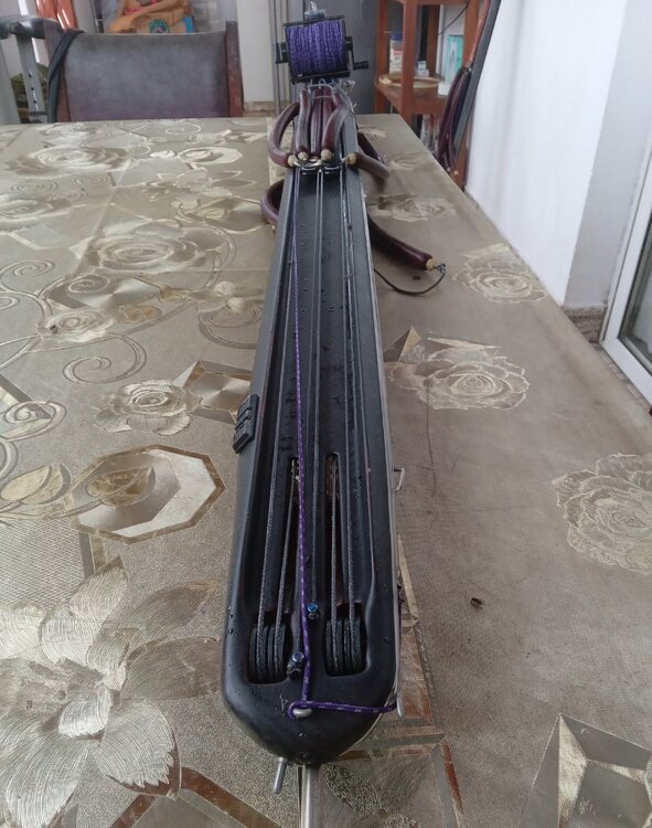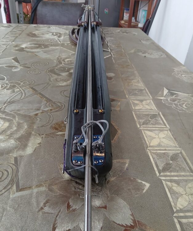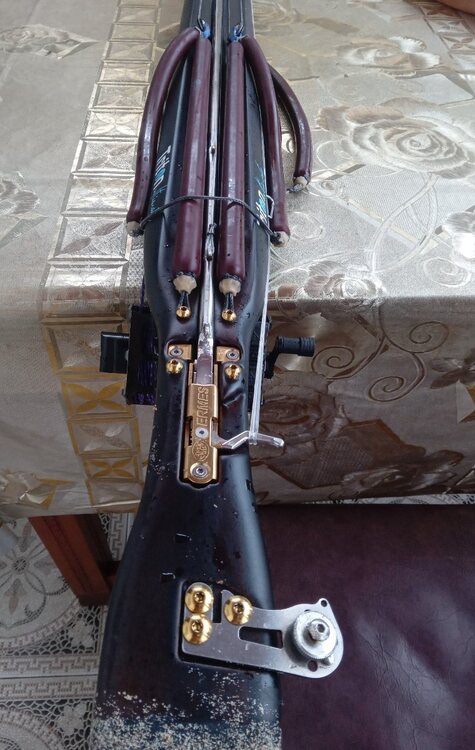 Mon copain croate est arrivé il y a quelques jours, pour la saison de pêche 2025/2026 Il ne chasse comme moi qu'au moulinet, mais son nouveau fusil est une merveille de réussite esthétique. 120 de fut, sandows sigal de 16mm, flèche de 8mm, 5 chargements pour finaliser l'armement(le double ardillon ne m'a pas convaincu) On voit que le moindre détail est soigné, particulièrement les gorges des sandows avec aucun frottement sur le fut. Poulies en céramique et chappe en titane, tout est super beau, fabrication par un local croate en bois et recouvert de carbone: zero défaut visuel, vis et mécanisme doré à l'or fin. En partant de la flèche qui pendouille, il met 3 mn pour être prêt à tirer. Il a fait quelques poissons de 5 à 10kg pour l'instant en 3 sorties, dont une pêche de 40kg