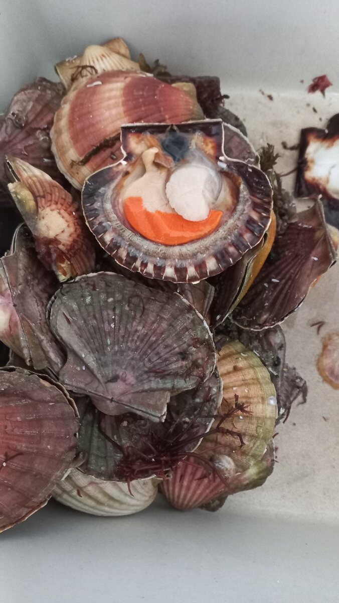 ⅕Quota de Saint Jacques du côté de Saint lunaire avec les copains du club entre 11h et 12h30 ! Mi marée montante voir fin de montante. Il y avait 12 à 13 m de fond ! Une eau translucide c'était génial. Le corail est bien rouge vif en mer aussi -