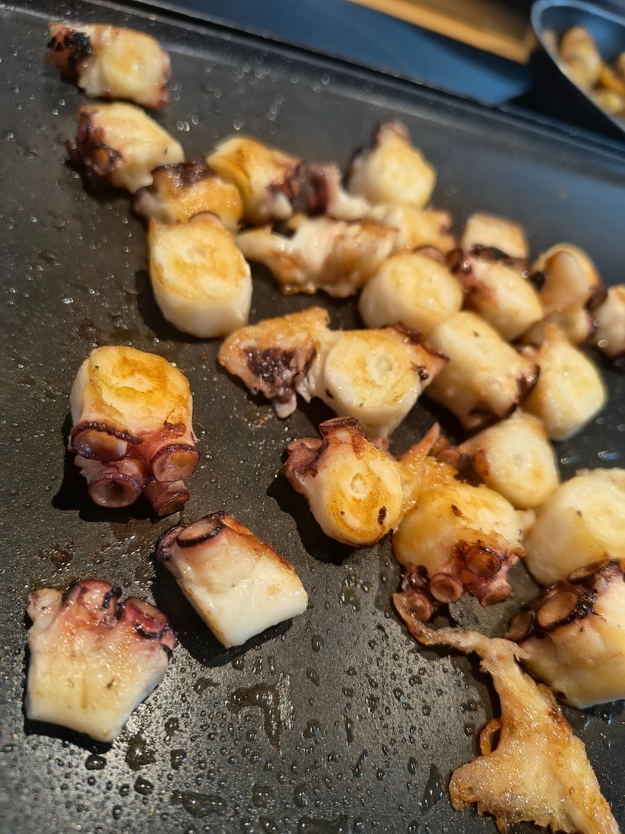 Miam ! et merci pour l'astuce du gros sel. mes petites darnes poélées (sans la peau) juste croustilantes sur toutes les faces. ça fonctionne très bien le 1er jour après la cuisson à l'eau . le lendemain la chair perd un peu de son moelleux en les grillant . J'ai pu gouter aux seychelles leur recette au poulpe , soi disant la spécialité...j'ai été vraiment déçu de la cuisson.