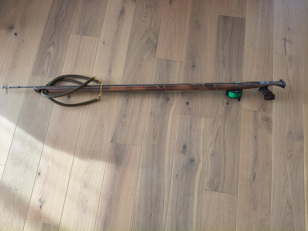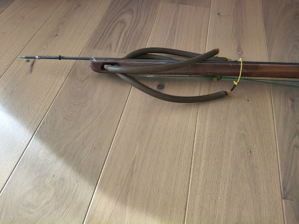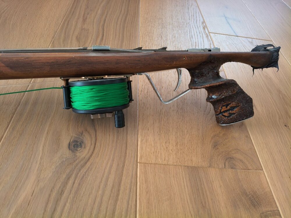 Arbalète en Bois artisanal - Réalisé en teck Birman - double sandows Devoto - Flèche Devoto à ergots 7 mm - Crosse ergonomique droitier avec une excellente prise en main - Mécanisme inox Ermes sub - moulinet horizontal tribal HUNT 100 avec dyneema prix neuf 599 euros; prix moulinet hunt: 79 euros. prix demandé: 400 euros