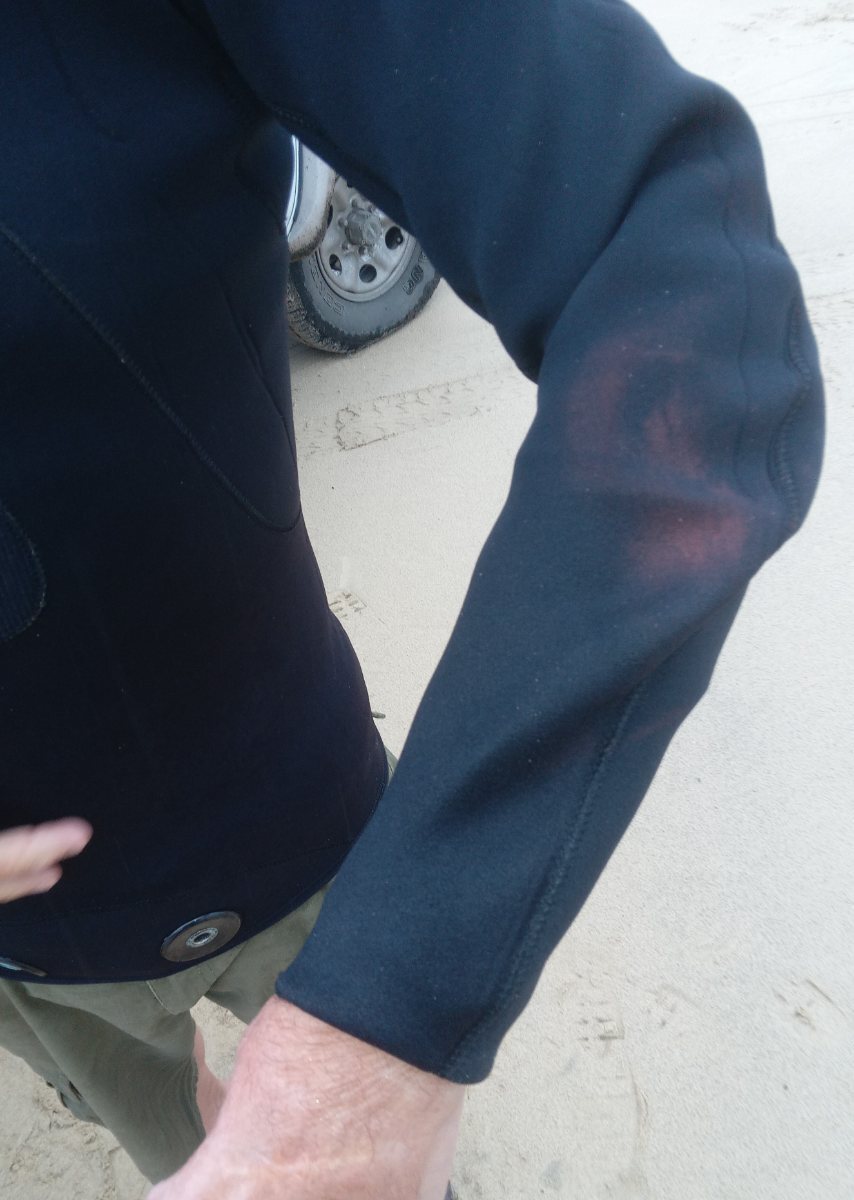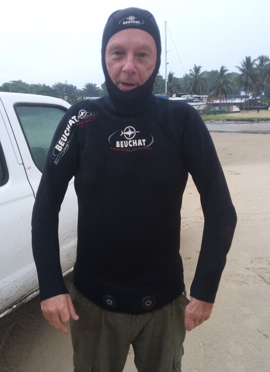 Alors, voici quelques photos de la combinaison Beuchat, car je suis sorti aujourd'hui. Vous verrez le CR demain, mais j'en ai profité pour prendre les photos de la bavure de chez Beuchat. Le tronc est assez propre, ainsi que la largeur d'épaule et la cagoule est un modèle du genre: parfaite! Par contre les bras.... no comment Quant à la sous cutale, je ne ferais aucun commentaire! On peut également voir que la veste et un poil courte Si en général Beuchat fait de bonnes combinaisons, là il s'est planté méchamment. Pas grave, l'eau est à 30° en surface et la combi sert surtout contre les piqures de méduses. - Aujourd’hui