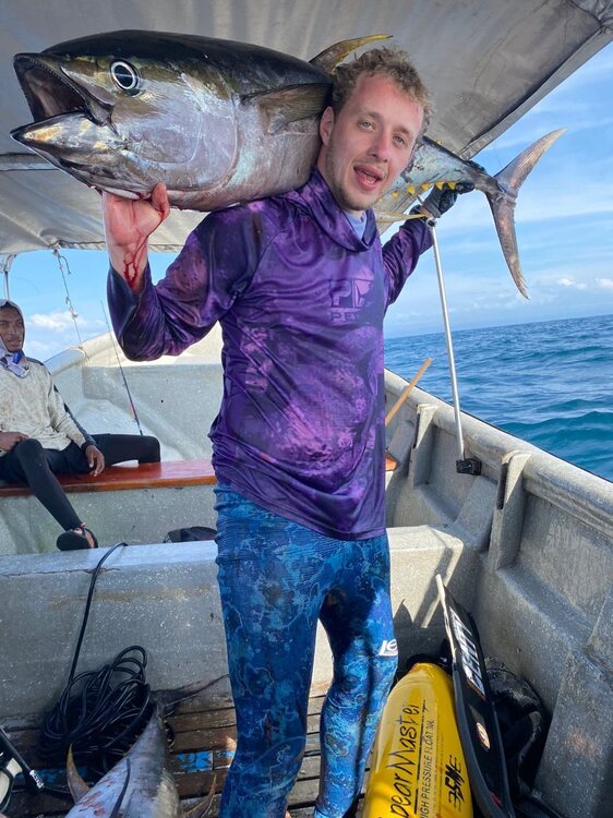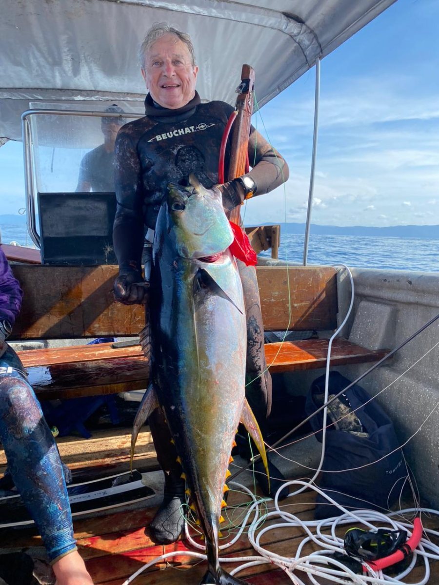 Bon je vais pas en faire des tonnes mais pour ceux qui pensent qu avec des flèches démontables on ne peut faire que du petit ....serioles 15 et 20 kg rouge 20 kg et maintenant thon 35 kg .....ah oui j oubliais 2 thons fait au moulinet .... Un par moi avec mon parachute ,35 kg pas trop mal tiré traversé partie milieu un peu arrière de haut en bas ,un peu travers 10/15 m pris avec le parachute,ok il a un peu souffert car sûrement pas fait pour cela et pas assez solide mais bon entre les serioles et le rouge ....maintenant thon de 35 kg Le deuxième fait par loic ,tiré dans la queue un seul ardillon dedans .....il a pris 80 a 90! M de fil sur des fonds de 1000 m mais peut être qu il sait gérer un poisson ? 😅 -