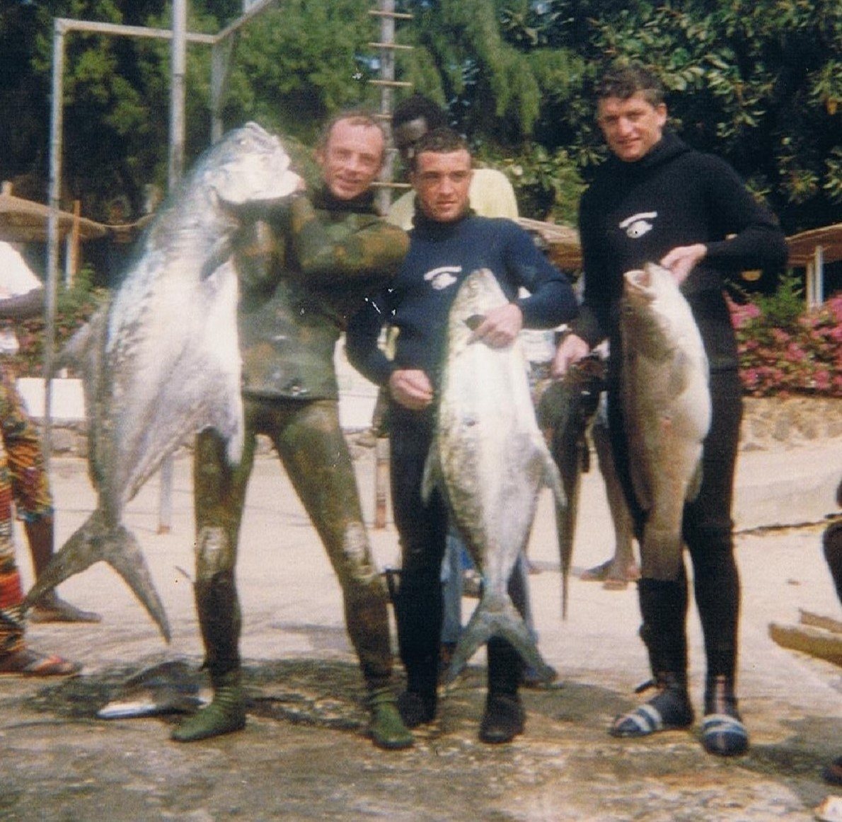 J'ai chassé des djabars, je pense que tu n'étais pas né, à l'époque ils faisaient 82 et 84 kg, ceux sortis par mon barquero à la palangrotte il y a plus de 40 ans, et on chassait avec des 110 un seul sandow et flèche de 6.5mm, il n'y avait pas autre chose en matériel sauf les fusils polynésiens en bois de 160 introuvables, un seul élastique aussi et Riffe qui commençait ses débuts pour lui même. Tiens une photo (record du monde fictif , pas prêt d'être égalée) avec ce fusil tube alu 25mm , sandow de 18 blond(mou) et donc flèche 6.5mm: liche de 45kg au Sénégal. La flèche rebondissait sur les djabars, les plus gros sortis furent de 14kg, mais avec un double sandow comme maintenant, même simplement de fut130net flèche de 7.5mm, j'en aurait sorti un de ces gros. La petite liche tenue par mon copain fait 17kg et le tiof 12kg. Je ne critique pas du tout ce magnifique fusil que tu te payes, je dis simplement que l'on peut sortir autant de poissons avec du matériel simple et adapté, mais surtout, le plus important ce sont les capacité cognitives pour lâcher un tir ou encore faire une approche, que le fusil. Sans cela, tu ne feras pas plus de poissons, même avec ce superbe gladiator. -