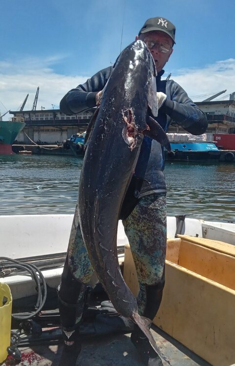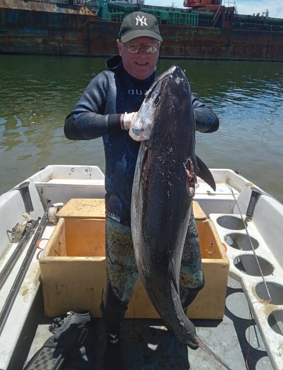 CR du 30 decembre 2025 Sortie à 7h du port direction le nord, 2 jours qu’il fait beau donc je tente au large en espérant y trouver de l’eau claire. Mer calme à agitée selon les endroits, remuée au large, plate au bord. Eau à 28° en surface, 23 à partir de 14m, forte thermocline qui engendre des particules à filaments, nombreuses avec les eaux de ruissellement des jours précédent. La visi va de 8/10m à 15m selon les endroits et même juste quelques mètres de visibilité en terre. On va résumé ainsi : aucun poisson jusqu’au dernier spot, quand je dis aucun c’est aucun même les alevins/juvéniles et mange sont absent de partout. 10heure, Le dernier spot sur le retour : le canyon. Mise à l’eau avec le baron, après une minute je vois tourner un dos noir sous le baron, descente à 8m, j’identifie un TDC de belle taille déjà, je m’approche à 5m de lui et lui lâche la flèche sur le haut du dos. Est-ce qu’il a viré ou est ce moi qui ai bougé avec le gros clapot, toujours est il que la flèche pénètre sur le coté gauche(alors qu’il me présentait le flan droit) , s’enfonce sous la peau et ressort sous la pectorale gauche, il tient par 1cm d’épaisseur. Il démarre illico, ce qui est normal, je vois la flèche de 2m faire un U avec l’accélération. Là je me dis, peu de chance de le tenir faut tout faire en douceur pour un faible espoir. Il n’est pas nécessaire d’espérer pour entreprendre ni de réussir pour persévérer.(Guillaume d’Orange) Je le laisse partir, freine à peine le fil, j’appelle de suite le barquero afin qu’il me passe la bouée. J’essaye de clipper le snape sur la boucle métallique de la poignée Picasso magnum, mais ça ne rentre pas : trop petit la boucle ! Je clippe finalement sur le fil du moulinet, il ne reste plus qu’une quinzaine de mètres sur les 130. La bouée se déroule, avec les 20m de fil et le bungee….qui lache au premier rush. Le dyneema interne tient bon, heureusement. Le thon ne tire presque plus, je ramène doucement, passe la bouée au bateau et ramène brassée sur brassée le fil du moulinet. Il est toujours bien vivace, je demande un second fusil, l’arme et vais lui coller une flèche dans l’ouïe. Grosse hémorragie immédiate et il meurt de suite. Le plus amusant c’est que avant de partir j’ai dit à Angelo : un poisson de 25kg et on rentre à la maison et c’est ce qui s’est passé. 11 heures le retour au port. Le premier TDC de la saison, 2 de vu dans l’année 2025 et un de tiré/sorti. La tête fait un peu plus de 4 kg. Alors JP, il s'améliore Angelo pour les photos? 😆 - Aujourd’hui