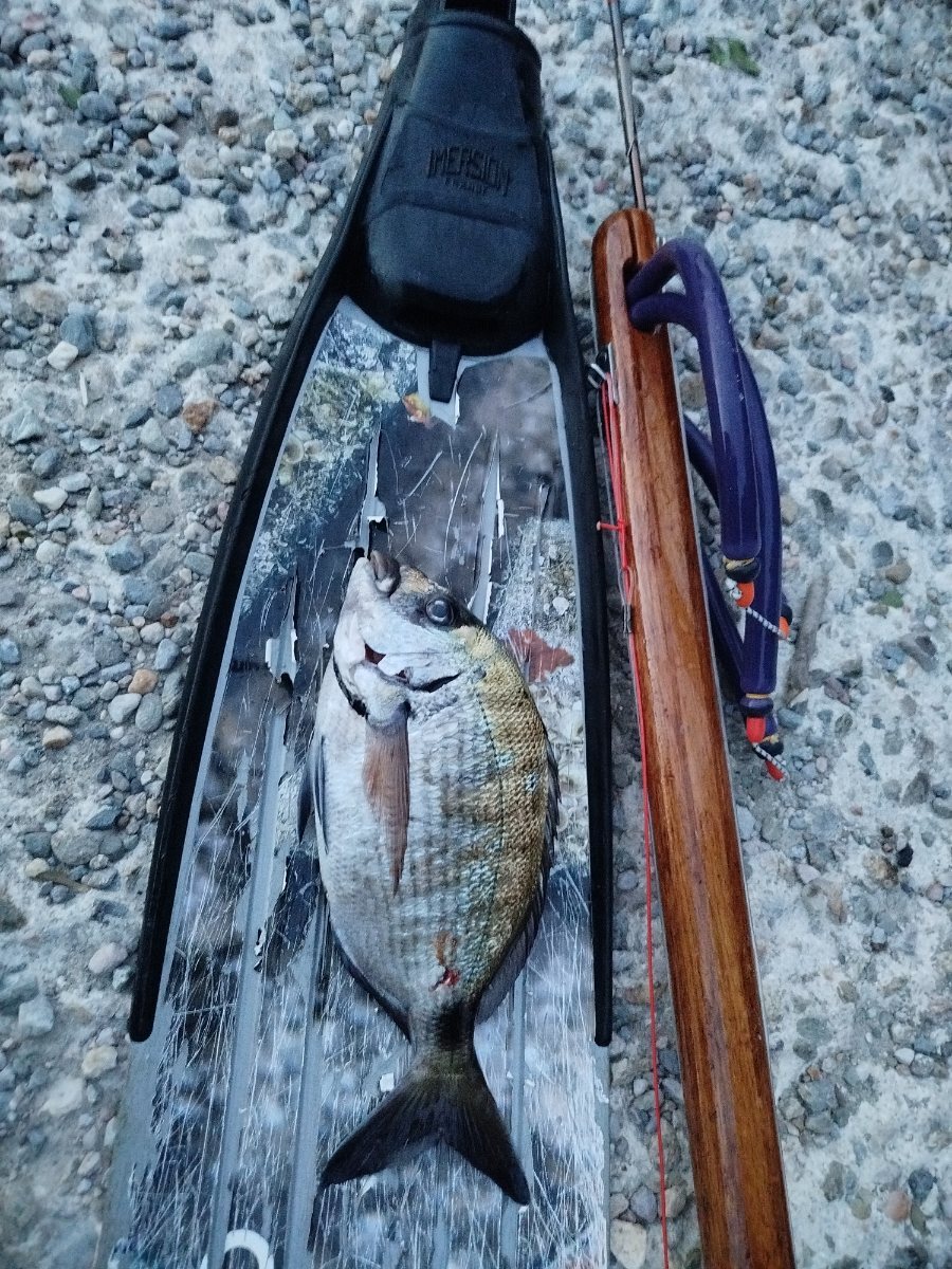 Derniere (?) mise à l'eau avant la fermeture du loup sur la côte rocheuse. Coup du soir, bonne visi, il fait bon dehors, pas un souffle, mer d'huile. Eau à 14° la 7mm est sortie du placard...mais l'invasion de méduses violettes était une surprise Daurades et sars sont de sortie, mais méfiants. Celui là n'aura pas de bol, tiré de très loin, de la surface, posé sur une pierre affleurante, décidément ce fusil me plait ! Agachon dans 5m d'eau, un beau loup passe tranquillement en surface à 10m de moi, il ne me verra pas malgré mes appels répétés... Session un peu courte mais de quoi manger et surtout de quoi rêver de mer cette nuit