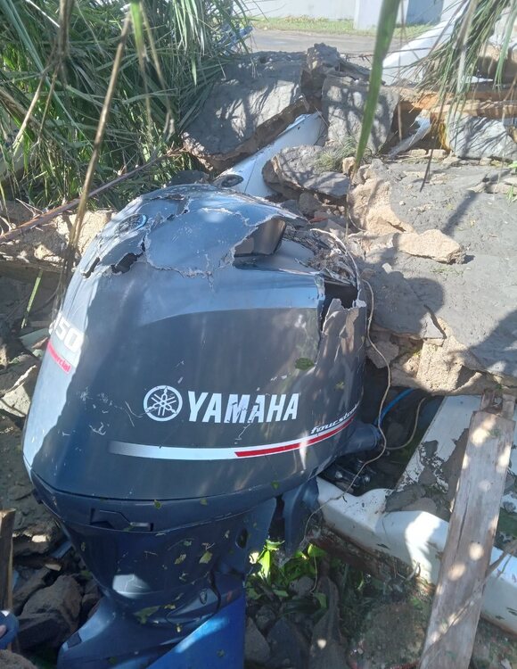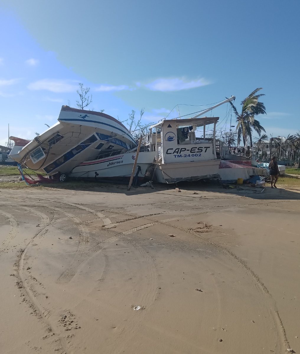 Des nouvelles de Madagascar Le cyclone est arrivé ce 12 février à 18 heure et il s’est arrêté vers 1 heure du matin avec l’œil pile qui est passé sur Tamatave vers 10h. Les dégâts sont terribles, 95% des maisons bois sont détruites et environ 10% des maisons en parpaings, souvent un étage s’est écroulé avec le toit qui est parti. Personnellement nous avons eu deux fenêtres qui se sont arrachées du mur et propulsées à l’intérieur et bien sur des mètres cubes d’eau ont envahi la maison. Une baie vitrée qui se trouve sur une terrasse fermée par des claustrats a explosé avec un effet venturi des claustrats. 75% de Tamatave est détruit, l’avenue de l’indépendance avec ses 300 palmiers, sont tous morts arrachés ou décapités, ces palmiers à huile avaient résisté au cyclone de 2018 où le vent avait atteint 250km/h, seuls un ou deux étaient tombés. Des bâtiments de l’époque des français près du port se sont écroulés. Beaucoup de murs d’enceintes sont par terre. Le réseau électrique moyenne tension est détruit à 50%, pylônes béton cassés, renversés ou décapités. Le réseau électrique normal est lui détruit à 100%. L’adduction d’eau est revenu hier pour les rez de chassée, de grosses fuites empêchent une pression suffisante. Il faudra 6 mois pour le réseau électrique. Bien sur pas de télévision, ni de réseau internet, et de rares possibilités de téléphone. Au lever du jour, un spectacle de fin de guerre et tout le monde s’est mis au travail, qui pour ramasser les débris, récupérer des tôles et redresser des clous pour rebâtir et se mettre à l’abri le plus vite possible, enlever l’eau et les feuilles des maisons encore debout, bien sur plus aucune feuille sur les arbres et les 2/3 sont cassés. Au pays du mora-mora (doucement, doucement) je suis assez stupéfait, personne n’attend que le gouvernement, les assurances ou je ne sais qui, vienne à votre aide, ici c’est aide toi et le ciel t’aidera. Tout le monde s’est mis au travail illico. Je pense qu’il y a bien 100 000 personnes sans abris au minimum, la seule aide ce sont des tentes chinoises qui sont arrivées le troisième jour, de grande tentes familiales qui semblent très bien, rien de l’ONU ou de la CEE….. Depuis deux jours, plein de gens ramassent bénévolement les tas de déchets immenses, des milliers de mètres cubes, qui encombrent les rues, un repas succin offert par la mairie à midi. Tous les magasins sont restés fermés 8 jours, la nourriture se faisait rare et plusieurs heures d’attente pour acheter un bidon d’essence pour le groupe. Mais ca y est, de ce coté c’est presque revenu à la normale, faut dire que toutes les réserves de carburant de Madagascar sont ici à Tamatave. Le pire c’est mon bateau, sorti et mis à l’abri sous le hangar pour nos trois navires. Le toit s’est arraché évidement, avec la charpente mais le mur du fond de 5m de haut, est tombé sous la poussée du vent et d’un gros palmier coco déraciné qui lui est tombé dessus. Le linteau de béton de ceinture a fait du mal aux moteurs. Surtout le mien plus haut que les autres. Capot broyé, plastique de protection de la distribution cassé mais c’est surtout les deux poulies d’arbre à came qui sont HS. La dérive d'embase aussi est cassée. Sous le poids du beton, deux fusées de roue se sont arrachées du chassis, une jante et un pneu sont morts écrasés par le poids. ce qu'il reste du hangar. Ca c'est mon bateau!!!!!! On ne le voit lus sous le beton du mur. Il y en a qui ont plus souffert que moi; voici un joli tas de bateaux sur la plage, pourtant sortis de l'eau mais le vent les a roulé les uns sur les autres. -
