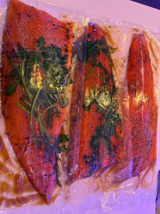 3 pépères de 3kg chacun en SSV également 4% de sel fin de guérande, 1% de sucre la vergeoise, et 1% de poivre mixé avec du fenouille + coriandre et aneth. 14h sous vide ça partira ensuite 48h en séchage avant de prendre la fumée avec le froid en ce moment c’est plutôt le bon timing….