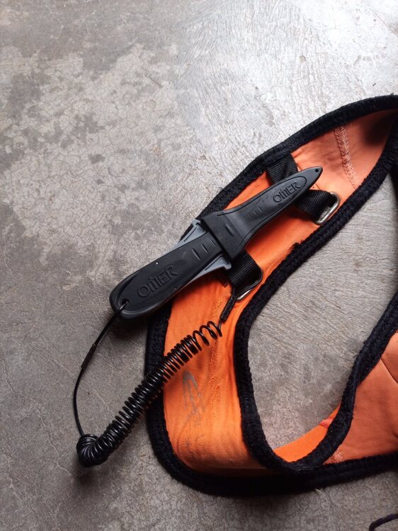 Pour ceux qui chassent au baudrier, j'ai toujours mis un couteau à gauche manche vers le bas sur la bretelle et je le fixais à l'époque avec des colliers en plastique. Maintenant les baudriers en néoprène sont équipés de sangles. Il est ainsi accessible aussi bien de la main droite que de la main gauche. Un petit couteau, affûté comme une lame de rasoir. Ca m'a sauvé la vie une fois en me trouvant pris dans les mailles d'un filet japonais et évidemment en fin d'apnée...