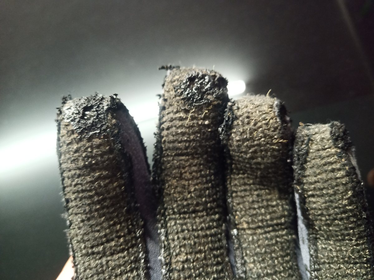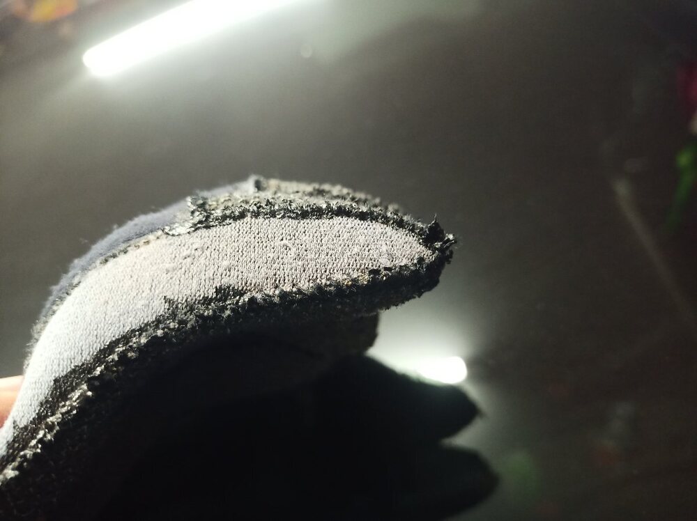 Ça fait une éternité que je n'achète plus que des gants avec renforts palmaires et digitaux*, ici dans le Channel on fait beaucoup de trou et à cause du courant on doit s'accrocher aux cailloux, de ce fait la main gauche (pour les droitiers) prend cher et même renforcée elle ne dure pas une éternité. Faut aussi si possible renforcer les coutures au polyglut car c'est le point faible de ce système. Quand le tissu est percé on peut encore le faire durer avec un peu de polyglut mais faut pas exagérer car c'est aux dépens de la souplesse évidemment. * En pseudo "kevlar"... Je pencherais plutôt vers une fibre synthétique du genre de celle qui compose le dyneema. Trou index/majeur : Coutures + polyglut : À noter que l'enduction des coutures au polyglut avec un très petit pinceau est particulièrement longue et fastidieuse , attention aussi à ce que les doigts ne se touchent pas en séchant sinon ils se collent.☹️