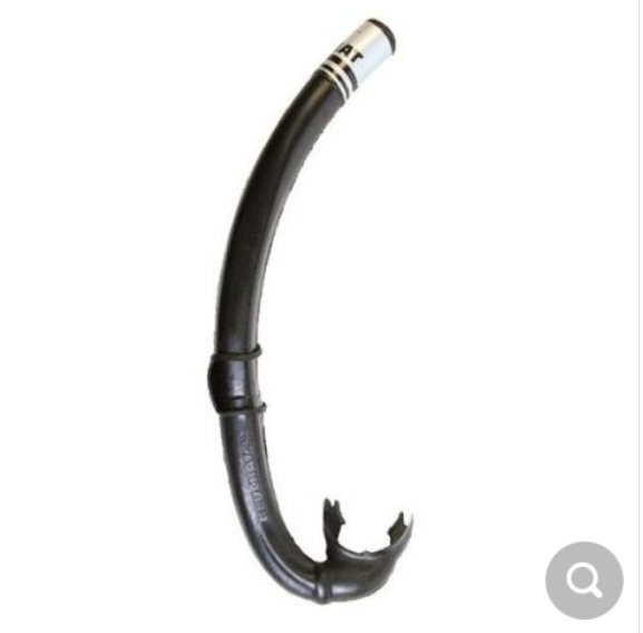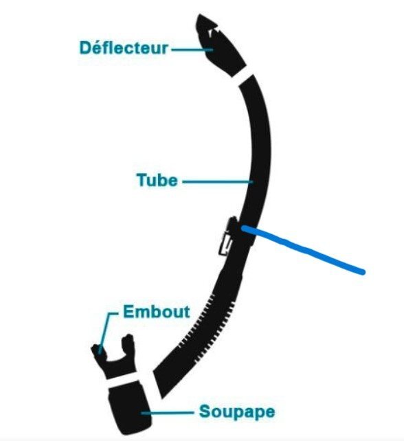 5. J’ouvre un nouveau chapitre sur le tuba, que j’épinglerai dans les tutos de bricolage ensuite. Chapitre autant pour les débutants que les confirmés. En premier lieu il sera question du tuba lui-même et en second la façon de le porter, de le positionner. Organe principal de notre sport, il en existe de toutes marques, de toutes sortes aussi, car cet ustensile a bien évolué. Un bon tuba ne doit être ni trop long, il devient fatiguant à repousser la colonne d’eau à la surface, ni trop gros en diamètre intérieur pour la même raison et ni trop court pour ne pas aspirer de l’eau avec du clapot, mais suffisant pour bien respirer. De nos jours beaucoup de modèles sont dans les clous. L’embout devra être en silicone, le caoutchouc se mange, vieilli trop vite. Faisant partie de ceux qui gardent le tuba en bouche lors de la descente (en lâchant l’air, bien sûr) pendant pffffu , beaucoup d’années , j’en changeais quasi deux par an car je coupais l’embout avec les dents, surement du à une crispation au fond ou lors de tirs. Depuis que je suis passé avec un silicone épais, je n’en ai pas changé, j’ai toujours le même. Les tubas avec valve qui relâche l’eau par le bas, fonctionnent un certain temps, puis un grain de sable s’immisce et c’est l’inverse, c’est l’eau qui pénètre, donc à mettre de côté. De toute façon plus c’est simple, mieux c’est. Les tubas à obturateur/déflecteur par le haut sont pour la surface, le snorkeling, pas pour la chasse, trop gros en haut, ils freinent et gênent lors de la descente. Les tubas rigides en plastique peuvent s’accrocher lorsque l’on rague et vous arracher le masque lors du retrait de la tête du trou. Il faut les prendre souple, c’est mieux. Un schéma avec descriptif, suit ; le trait bleu c’est la bague dans laquelle on passe la lanière du masque, j’explique plus loin pourquoi. Les tubas annelés comme sur le schéma, retiennent un peu d'eau dans les anneaux, donc à éviter, ça fini par être désagréable. En discutant sur le forum, pendant des années j’ai entendu parler en bien, du tuba tubair de Beuchat et pour l’avoir essayé c’est vrai qu’il est presque parfait. Embout en silicone, bonne longueur et bon diamètre, courbure idoine et enfin corps en caoutchouc ou similaire qui se tord facilement sans se détériorer. Le tarif actuel de 37€ n’est pas prohibitif au vu du temps que vous allez le garder. Je ne suis pas sponsorisé par Beuchat, ni ne possède d’actions chez eux, je précise. Lorsque l’on tape » quel tuba choisir » sur le net, on tombe sur des publicités qui vantent leur matériel, donc méfiance, leur but c’est de vendre et ils s’adressent à tout le monde pas aux chasseurs spécifiquement. Vos remarques sont les bien venues