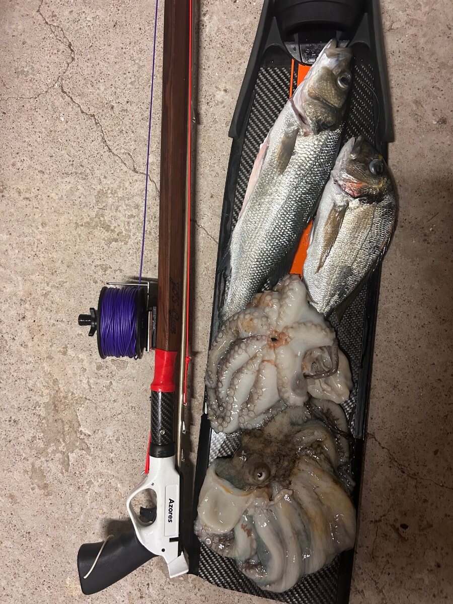 Sortie du bord avec mon fidèle jos gun mekoua 90 cet après midi. Avec ce vent d’est et cette pluie me dis que je vais aller tenter dans peu d’eau voir s’il y a du loup. Je me mets à l’eau un poulpe dans mes pattes je le chope puis je continue de nager et en fait un autre. Premier Agachon une daurade vient pile au moment ou je décolle du fond. C’est con me restait du souffle. Je continue deux trois agachons tout au bord la où ça brasse je fais le loup mon Jo’s gun tire parfaitement droit et super équilibre dans l’eau. Ensuite je vois une belle dodo dans les 3kg mais elle ne vient pas. Plus loin dans une faille je fais la petite dodo et il est temps de rentrer je ne vois presque plus rien tellement il fait noir. - Aujourd’hui