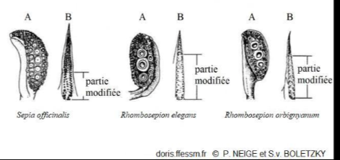 Si tu veux pousser un peu plus loin tu vas sur le site " Jacquie et Miseiche" et tu verras que le mâle a 2 tentacules modifiés* appelés " bras hectocotyles" qui lui servent de sguègue**.(B sur l'illustration) * Dépourvus en partie de ventouses. **En résumé la seiche pratique le fist-fucking.😁 - Aujourd’hui