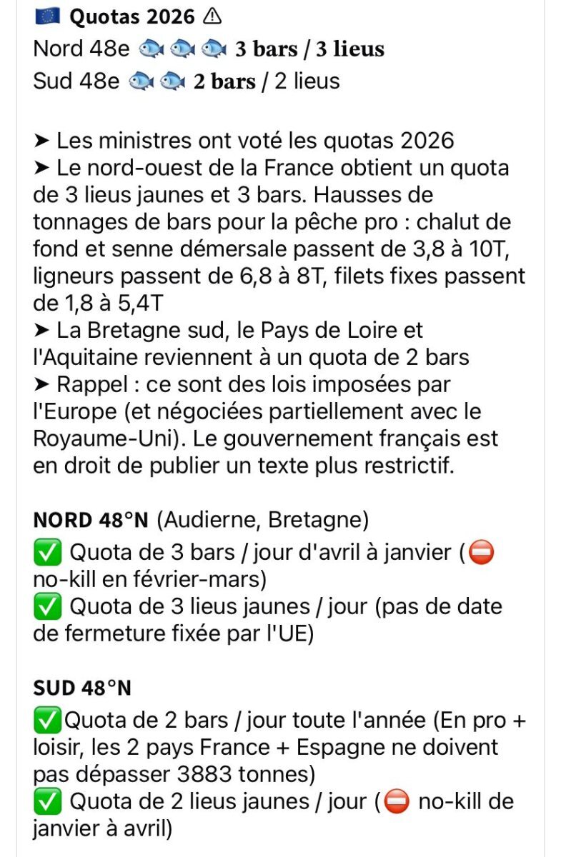 Les négociations sur l'évolution des quotas de pêche vient de se terminer, le massacre continue : "Quotas de pêche : les ministres se suivent, les lobbies restent, la destruction de l’océan s'accélère -" BLOOM Association https://share.google/U4p7VfF6ZbNjfc2at Pour les plaisanciers au nord du 48e c'est un peu mieux, mais c'est "open bar" pour les pros malheureusement. - Aujourd’hui