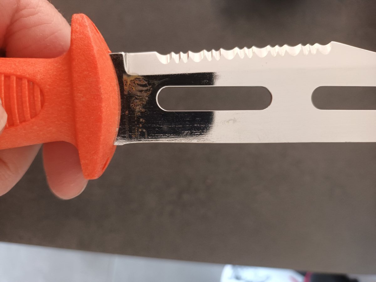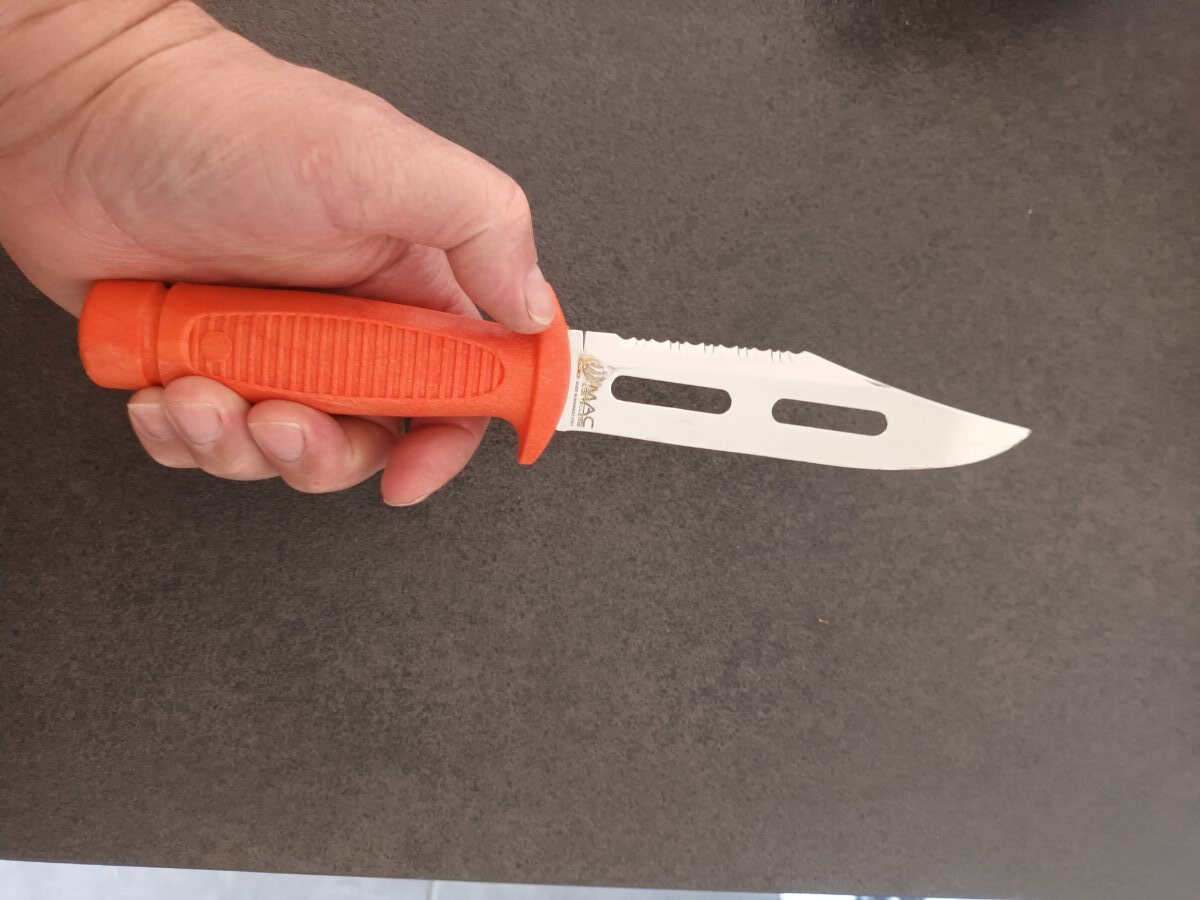 2. J'avais posté sur un autre sujet à propos d'un couteau flottant Mac J'ai fini par l'acheté. Comme on me l'a fait remarqué, il est très gros avec son fourreau. Mais pas gênant quand on fait un gabarit comme le mien (1m92 100 kgs h.t). Le couteau fait plastoc.. la lame est très tranchante mais elle fait plastique. Je fais une sortie avec, je n'ai pas été gêné par le couteau. Mais j'ai déjà un point de rouille qui à apparu. Mais il flotte bien!! Bref pas trop convaincu, il va rester sur un bateau ou ailleurs je pense