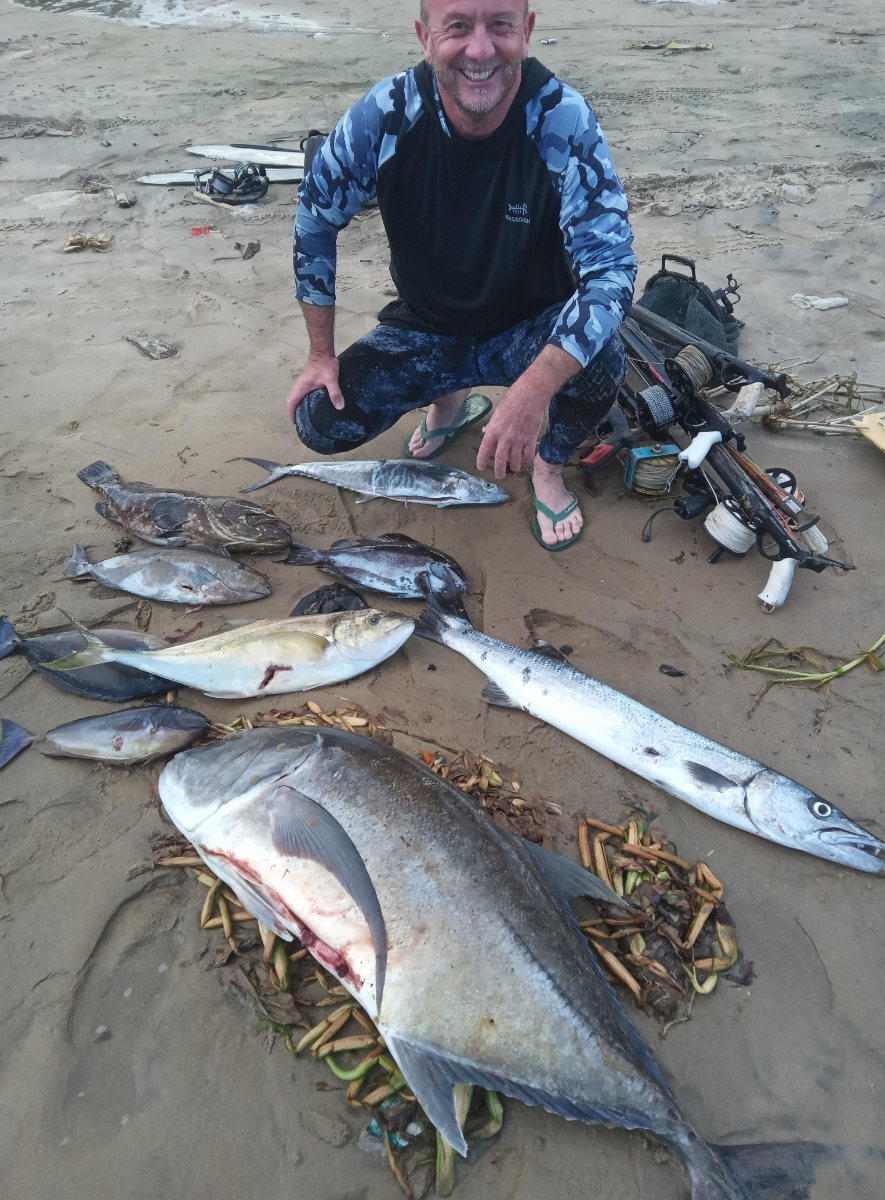 CR du 9 décembre 2025 Départ 9 heures du port de Tamatave, direction le nord. Mer agréable, vent de nord-est moyen mais avec absence de houle, du coup ça passe très bien. La visibilité ira de 12 à 15m selon les endroits avec une température de 27° à 25/24° plus bas. Nous sommes 3 chasseurs : Joel, Nono, et moi. Peu de vie en général, absence de mange à peu près partout, sauf au banc après rangazava où nous ferons le principal de la pêche. Cassure de l’ile aux prunes ; rien Le banc Rangazava : Joel place une flèche à 3cm derrière l’œil de cette grosse GT. Fusil de Joel : 130 beuchat carbone, flèche Hunt de 7.5mm et deux sandows Primeline de 18mm avec un moulinet Hunt. Le banc suivant, sans nom, je sors une carangue à points jaunes et Nono un petit thazard, Joel perd un thazard et loupe une carangue. Les bancs suivant n’apporteront rien, peu de vie et un fort courant de nord font qu’il est impossible de chasser sur les cassures. Le canyon : courant toujours fort, à la seconde dérive je vois un beau marlin bleu passer sous nos trois barons, mais trop furtivement. Il devait bien faire 150kg. Mes compères ne l’apercevront pas, occupés à armer leur fusil. Nono voit 3 beaux mérous mais entre 24 et 32m, impossible à réaliser avec ce courant. Les deux bancs du large : rien, pas de vie. Retour vers Tamatave en passant par le spot aux TDC, mes deux équipiers n’en peuvent plus et ne se mettent pas à l’eau malgré la présence de licornes enfin tant attendues. Je finis par tirer une grande bécune mais plutôt petite dans cette visibilité limitée à 12m de la faute à beaucoup de particules en suspension que nous aurons eu toute la journée. Retour au port à 16 heures -