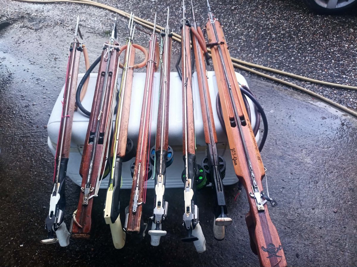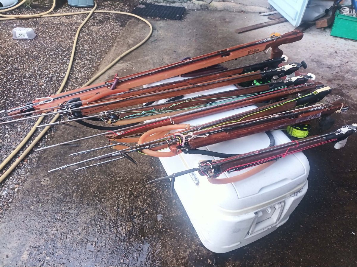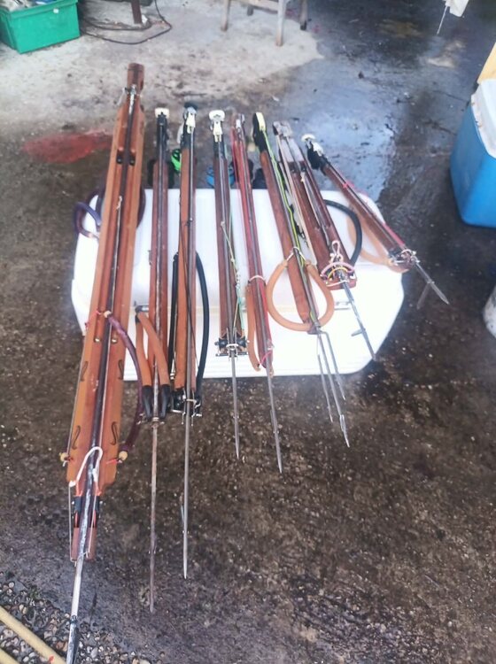 Bon voila ,ce qui me reste avec en plus le 80 Bouledogue B et l autre 100 Bouledogue B en test chez mon gamin dans le sud . Donc en partant du plus petit au plus grand , -Sar roller 65 eau tres sale pour les epave ou trés rocheux poignée Marlin , _Bouledogue 65 mon fusil principal puissant pendant tout l été ,poignée résine Sigalpour les maigres et les gros bars un peu loin .Fleche jager et mecanisme sigal _Spécial Bar , un trident de 82 que j utilise en epave avec de l eau un peu plus claire ou au printemps 2/3 fois dans l eau un peu sale ou en compétition mais avec le trident etroit .poignée merou d or, sandow 20 mm _Pas sur la photo mais il devrait y avoir un bouledogue B 80 ,avec sandow invert sur le coté et la partie roller en standard _Un mékoua spécial courant tres fin 25 mm circulaire environ meca ermes poignée résine,mono sandow de 18 mm longueur 82 cm _Un Sar roller 82 ,tete fermée qui etait mon fusil principal avant mon Bouledogue 65 en eau standard car lui aussi a une possibilité de tir a 4 m sur du petit poisson . _Un Sar roller 95 presque standard sauf la tete qui etait un essai non validé ,il sert surtout a mes enfants quand ils viennent car ils preferent les fusils longs -Un mekoua modifié (poignée male) en 100 cm avec une tete mono sandow a visser ,c etait pour faire un essai pour le fusil que voulait Marc que malheureusement on ne voit plus sur le forum _Pas sur la photo mais il devrait y avoir mais nouveaux bouledogues B 100 ,avec les sandows invert sur le dessus et le coté roller en standard _Un Djabar invert 135 ,poignée bois fleche jager 8,5 mm et méca sigal pour le Thon mais n a pas encore tiré sur un poisson 🤣 malgré 2/3 sortie l an dernier . -
