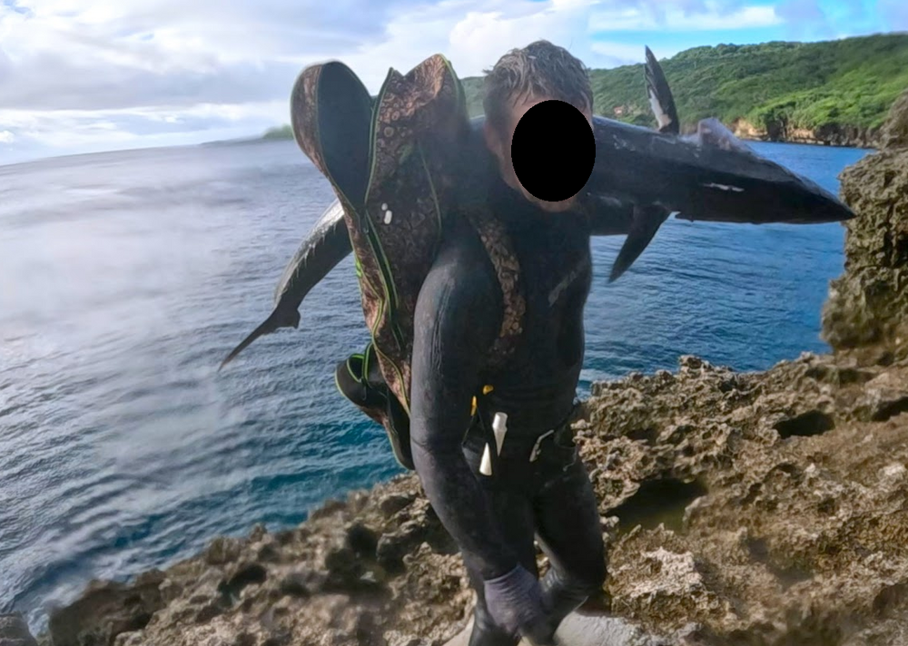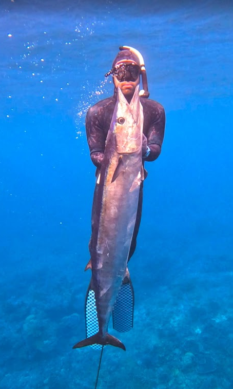 les gars partent sur le tombant, je suis derriere en voyant que le moulinet du fusil c'est derouler et la ligne c'est emmeler... bordel de fil, sans doute le filet a langouste qui c'est pris dedans et as foutu le bordel... bref, casse bonbon... je passe mon temps a essayer de demmeler le bordel dans l'eau, moi qui voulait faire simple en ne prenant pas mon bazooka, gagner... je passe 15min a essayer puis je coupe tous le bordel et refait les noeuds... je suis bien vener... j'aime pas passer mon temps dans l'eau a tricoter surtout que les collegues ont deja commencer a apater et enchaine les agachons... les requins sont deja en train de courrir partout et me raser les jambes... je finis finalement par remettre tout en ordre dans mon fusils, etant enerve, je met mon bout de sandow sur la pointe de la fleche et degomme un requin qui commencais a me saouler... la mal chance continue car la fleche traverse et l'ardillon est bloquer ! ahhhhhhhhhhhhhhhhhhhhhhhhhhhhhhhhh bondieu, quand ca veux pas... ca veux pas... donc pas de panique, je fais signe aux collegues que je gere, je laisse le requin partir plus bas et commence a retourner dans moins d'eau. De temps en temps je tire des coups sec sur la fleche, au cas ou l'ardillon voudrait bien se refermer et liberer la fleche... nope... bon, je file sur une patate de corail et laisse le requin s'y caller, je tire comme un bourrin quand le requin est bloquer sous le corail... me faudra encore 15min a jouer avec, jusqu'as ce que finalement, la blessure du requin est assez grande et l'ardillon sort ! enfin !!! on as tous perdu des poissons a cause de ses fichu ardillons ! je vois pas pourquoi j'aurais pas pu perdre ce requin ! ahhhhhh enfin, je vais pouvoir aller chasser, je recharge apres avoir verifier ma fleche, tous semble ok. Je retrouve les comperes qui me semble perdre confiance... apparement pas grand vie sur le coin. Je reflechis, revois le tableau des maree en tete, et propose d'aller faire un peu de bleu, Sam n'as toujours pas sorti de wahoo, j'ai un pressentiment que ca peu se faire maintenant, les gars attestent sans broncher, on file donc plus loin dans le bleu, moi en tete a faire danser mon barron, je ne veux pas apater, la derniere session avec le soyeux m'as quand meme un peu calmer et j'ai pas envie de remettre ca de suite, donc on nage juste a trois avec le barron dans le grand bleu, j'essai d'aller sur la zone ou j'ai pu tirer mes derniers wahoo les semaines precedentes, une fois sur la zone, j'enchaine les differents bruits a wahoo que je connais... et continue d'avancer, les collegues me regardent bizarrement en se demandant ce que je fais ! ahahah ca me fait rire, mais j'ai confiance, je nage devant eux, et voila ! je vois une buche de wahoo arriver par derriere, je me retourne et commence a plonger dessus, Sam etant derriere moi, il est deja dessus, et avec son gros fusil et la bouee, il as bien plus de chance, je le laisse faire, il aligne et lance le tir, le wahoo part a toute balle comme ils savent bien faire et coule meme la bouee !! c'est donc confirmer, c'est un beau bebe, les deux gars partent comme des fusees au cul de la bouee, je recupere le barron et les suit au plus vite... je les vois ralentir puis s'arreter... le wahoo aurait il decrocher ?! la bouee ne bouge plus... non, Sam as la floatline en main, et je vois le wahoo bien profond dans le bleu au bout de la ligne, le 3e gars commence a descendre dessus pour aller l'assurer... je vois bien que le wahoo est encore bien profond, m'etonnerais beaucoup qu'il puisse l'atteindre sur a mon avis plus de 20m et surtout apres le sprint qu'on viens tous de faire, j'en profite pour me relax en surface en regardant l'action, oui, le collegue s'arrete sur 15m, semble analyser le tir (de loin) et decide de remonter sans tirer... merde, on as eu du cul que les requins soient pas la mais ils vont pas tarder c'est certain, donc je plonge a mon tour... et viens mettre une fleche pleine tete dans le wahoo bien crever de sa session, j'entend les gars crier de joie en surface, je remonte le wahoo, le prend de suite en main, le saigne et le tue, puis le file a Sam... il est trop heureux a contempler son poisson, se passe 5 sec avant qu'un requin soyeux fonce a pleine balle sur le wahoo, heureusement que je matais, me doutait, je poke le requin et me cale entre Sam et lui... le requin est bien interesser par le wahoo, il nous suivra tout le long du retour et tenteras quelques approches mais sous controle, arrives au pied de la falaise, on feras quelques photos ! une belle buche que j'estime a 25kg. On galeras bien a le remonter jusqu'as la voiture ! mais quel bonheur encore une fois, son premier wahoo !!! quelle chance ! le poisson afficheras 24.84kg sur la balance. -