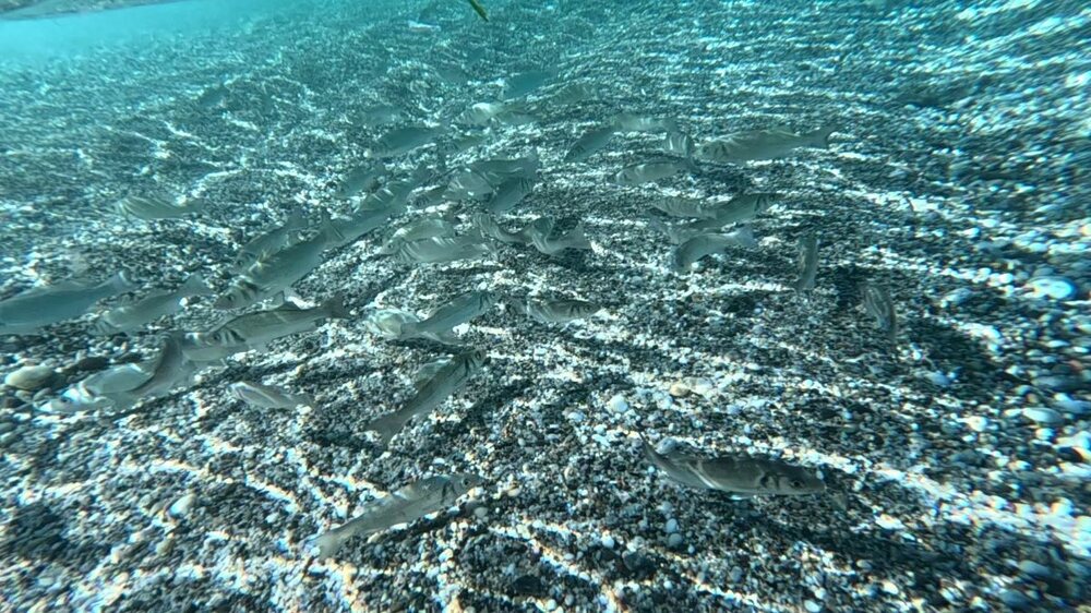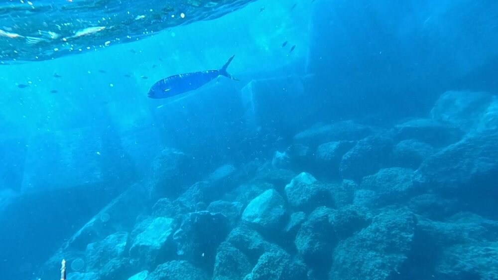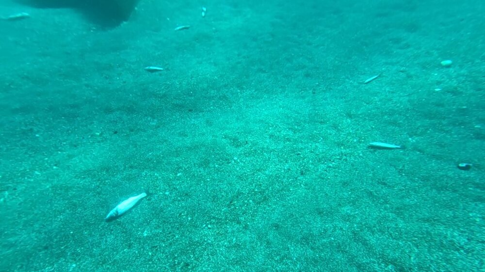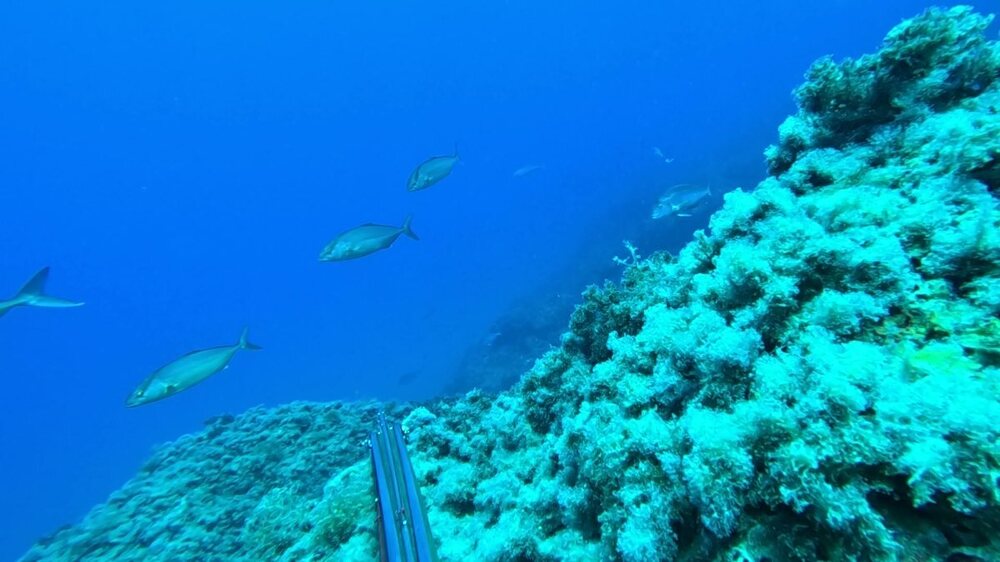CR 12/09 A carboneras Mise à l'eau 13h sortie de l'eau 17h Cela fait longtemps que je ne suis pas venu ici et j'en avais bien envie. Sans surprise l'eau est chaude est claire. Comme j'ai une heure de sortie limitée je décide de nager jusqu'à la dernière pointe pour chasser dans le sens du retour. Dans la zone où il y a la sortie d'eau chaude, il y a beaucoup de petits poissons morts au fond. Ce sont en grande majorité des bars tout petits, ce n'est pas la première fois que je vois ça ... Est-ce qu'ils proviennent de la pisciculture qui est au bord? Ou un lien avec la sortie d'eau chaude de la centrale ? ... est-ce qu'ils ont été tué par d'éventuels produits dans la sortie d'eau chaude ... mystère ... mais ça fait toujours peine à voir. En nageant pour rejoindre la dernière pointe, je vois qu'il y a plein de mange qui se fait persécuter par les petites sérioles et thonines. Arrivé à la pointe je commence la prospection, il y a des dentis qui me chargent mais ils sont un peu petits. Alors que j'agachonne en espérant un plus gros, c'est un beau barra qui me passe au-dessus, je l'aligne et tir, il fera 92cm. Je continue ensuite la prospection et me rend compte qu'il y a un thermocline à 17m, l'eau est à 22 degrés dessous. Je fais quelques agachons dessous sans rien voir puis tente de chasser un peu au-dessus voir si les dentis approchent. Ca ne sera pas le cas, je les ai peut-être effrayés lors des descentes précédentes, ou bien ils ont simplement décidés d'aller se promener ailleurs. En descendant je croise un banc de marbrés à coté du banc de petites sérioles, je tente d'en prélever un.. et rate le tir, il me semble constater en voyant le poisson fuir qu'il est blessé, peut-être un décroché donc. Sur le retour je tente des descentes aux endroits où la mange est très présente. je me décide à prendre une thonine même si elles ne sont pas très grosses mais ma seule tentative sera un raté. Retour en passant par la sortie d'eau chaude, j'y aperçois 2 lubinas sans arriver à avoir une possibilité de tir. Ensuite au bord de la plage il y a ces toutes petites lubinas, vivantes cette fois, dans 50cm d'eau.