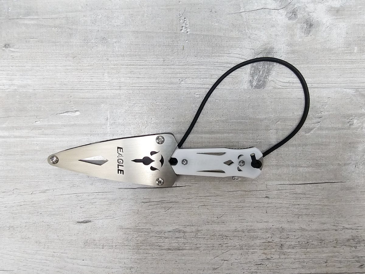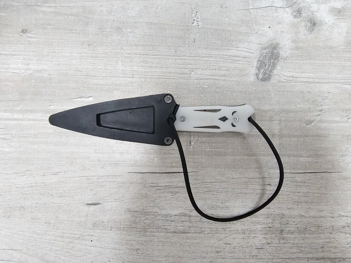 Alors regarde le montage que j'ai fait sur mon couteau de baudrier que je fixe pointe en haut évidemment. C'est un Ermes Eagle et vu son prix, je t'assure que j'ai pas envie de le perdre. Ton couteau semble pouvoir recevoir le même système. Un élastique genre tendeur fixé sur l'étui d'un côté et à l'extrémité du manche de l'autre. Lorsque tu tires dessus, il y a largement assez de longueur pour s'en servir. Et si tu lâches le couteau, tu es sûr de ne pas le perdre. -