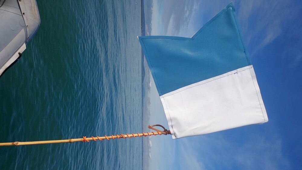 Pour que le pavillon reste "tendu" même en absence de vent il faut impérativement une entretoise en métal rigide en diagonale, et une matière "textile" (pas du PVC imprimé) pour qu'il dure plusieurs années ( tu verras que le vent et le soleil peuvent effilocher le tissu en quelques années, évidemment fonction du nombre de sorties). Tecnomar Drapeau de plongée Rouge | Diveinn https://share.google/xy2cRmgnXsg5EcmcC Ce bout de métal peut être bricolé avec jonc en inox, une paire de pinces rondes pour faire des boucles et du fil et une aiguille à coudre pour l'adapter à n'importe quel drapeau. -